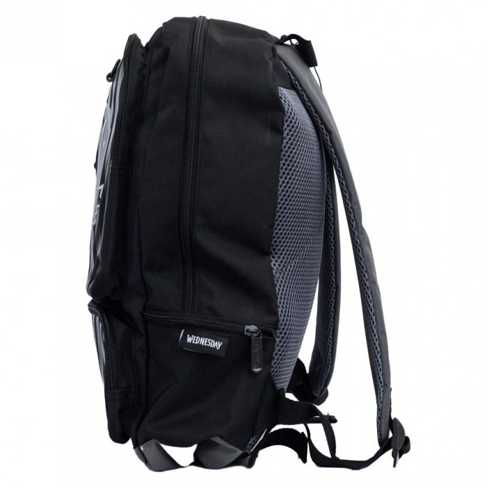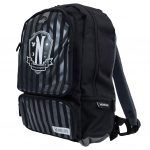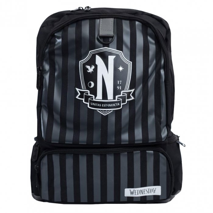 Black premium design back pack with silver Nevermore Academy and Wednesday logos