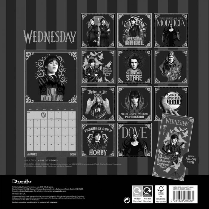 Featuring art work of the Wednesday characters and slogans