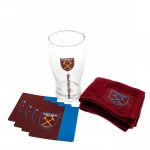 Mini bar set with tulip style pint glass featuring claret West Ham United text and full colour club crest